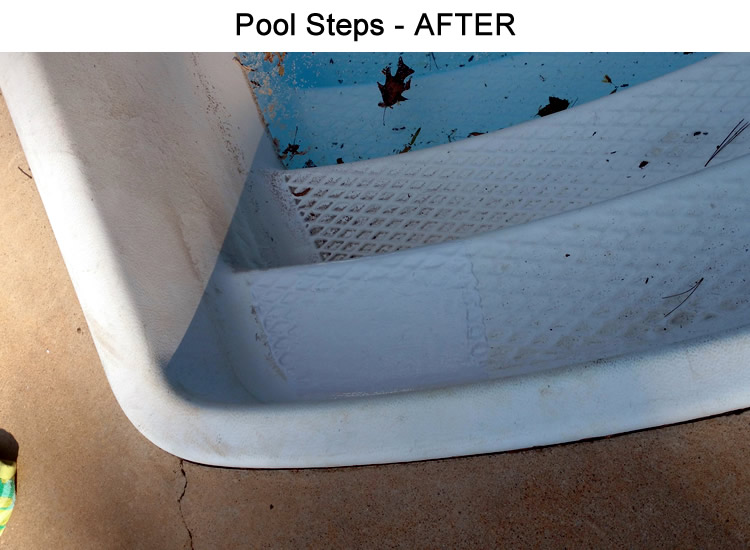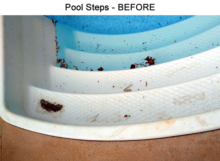 Concrete pool steps can be restored to a better than new status with our concrete staining process. It's fast and cost much less than an overhaul of your pool steps.